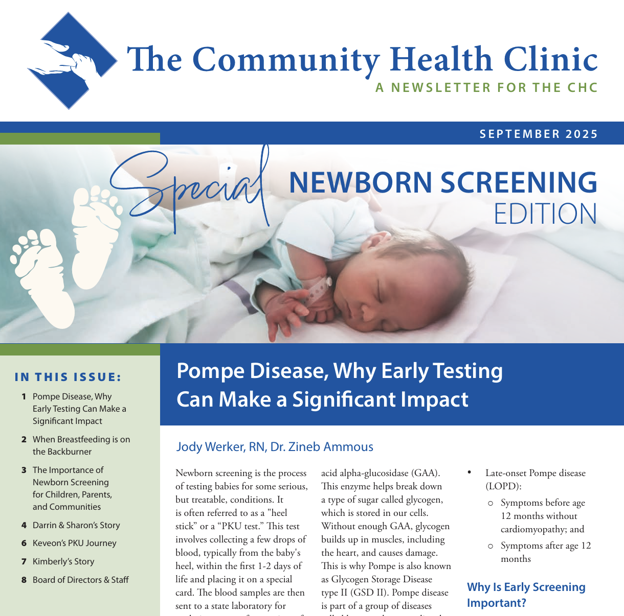 Read the latest newsletter from The Community Health Clinic — a Special Newborn Screening edition! This issue features stories and articles about Pompe Disease, Breastfeeding, the importance of newborn screening, PKU, and more.
