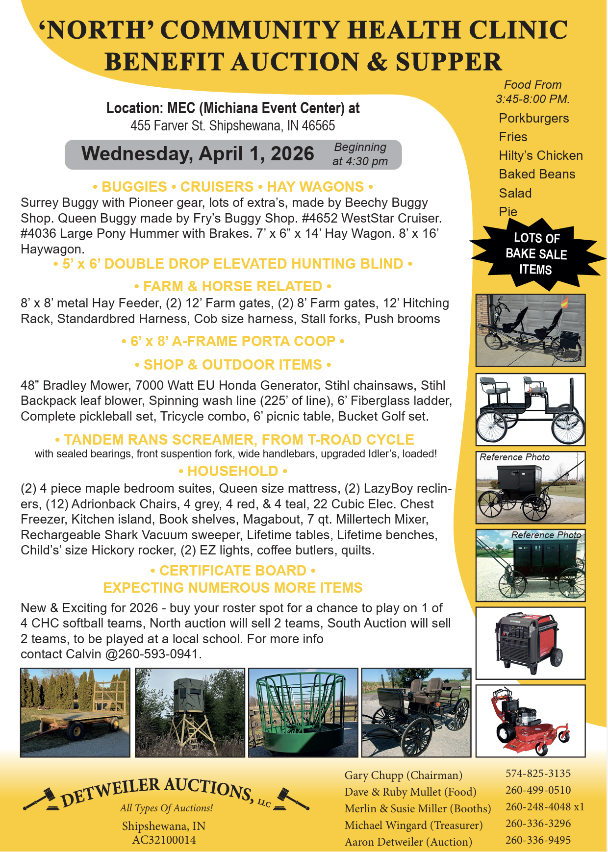 Join us in the live-bidding excitement at The Community Health Clinic’s Annual Tri-County Benefit Auction & Supper, on Wednesday, April 1, 2026 starting at 4:30 pm. Food will be served at 3:45 pm.