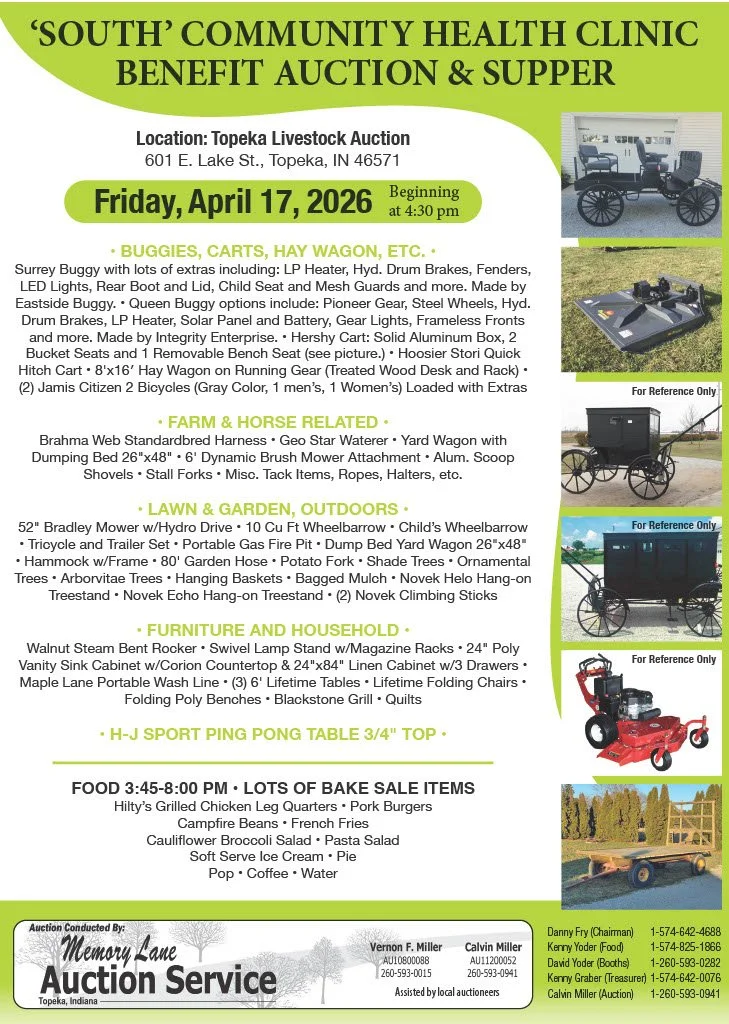 Join us in the live-bidding excitement at The Community Health Clinic’s Annual Tri-County South Benefit Auction & Supper, on Friday, April 17, 2026 starting at 4:30 pm. Food will be served at 3:45 pm.